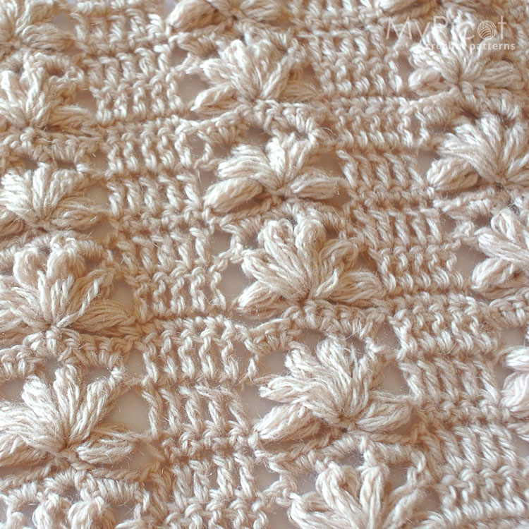 This crochet stitch pattern features puff stitch flowers and bands, creating a fabric with delicate vertical lace motifs reminiscent of lotus blossoms 🌸