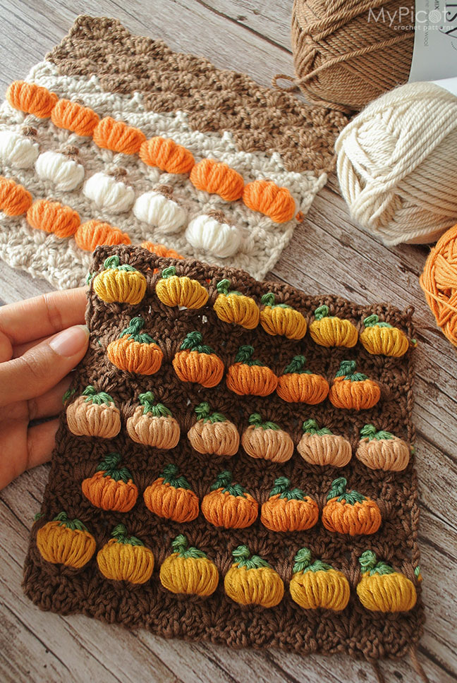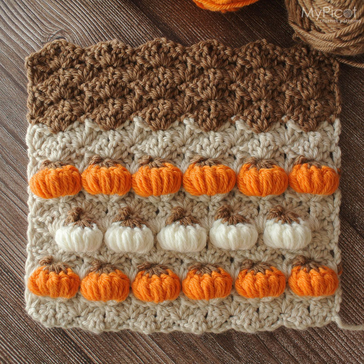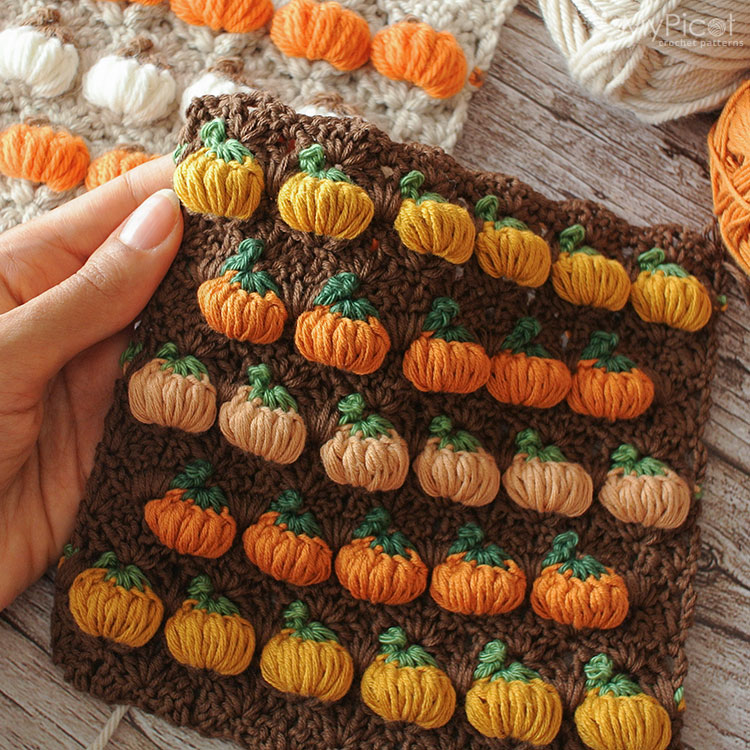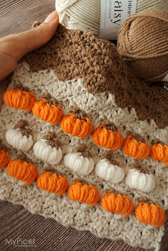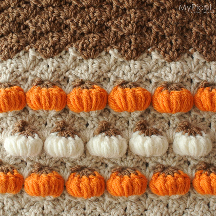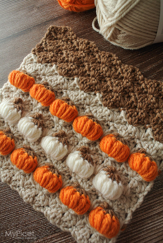 This playful pattern creates autumn texture with pumpkin motifs on a shell stitch background. Perfect for Halloween projects, Thanksgiving decor, seasonal blankets, cozy accessories, and fall home accents.