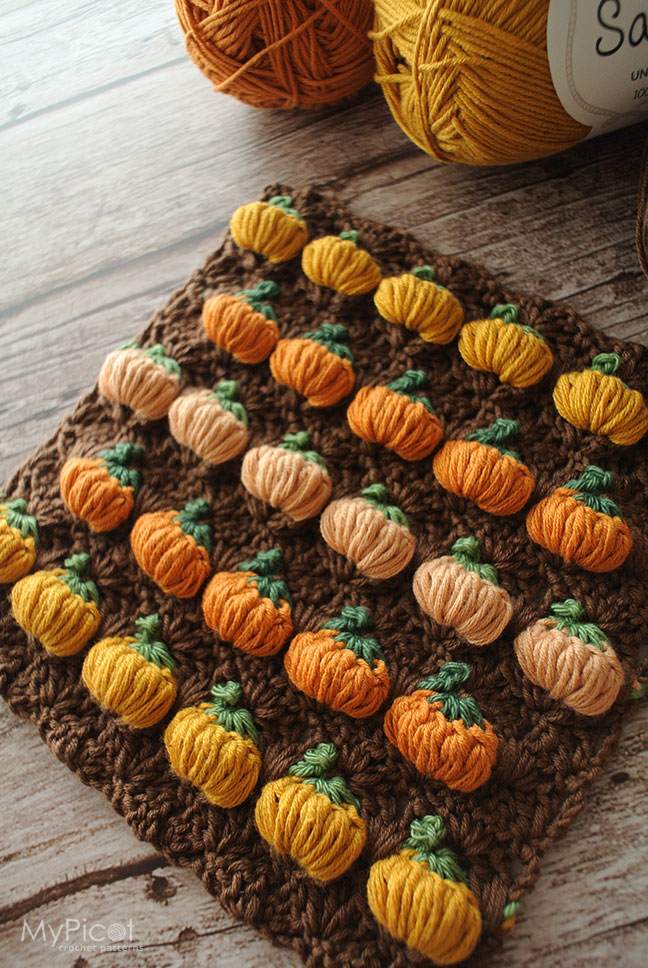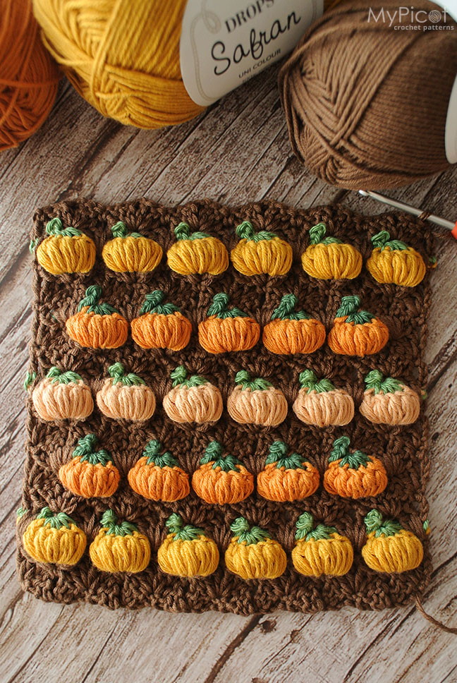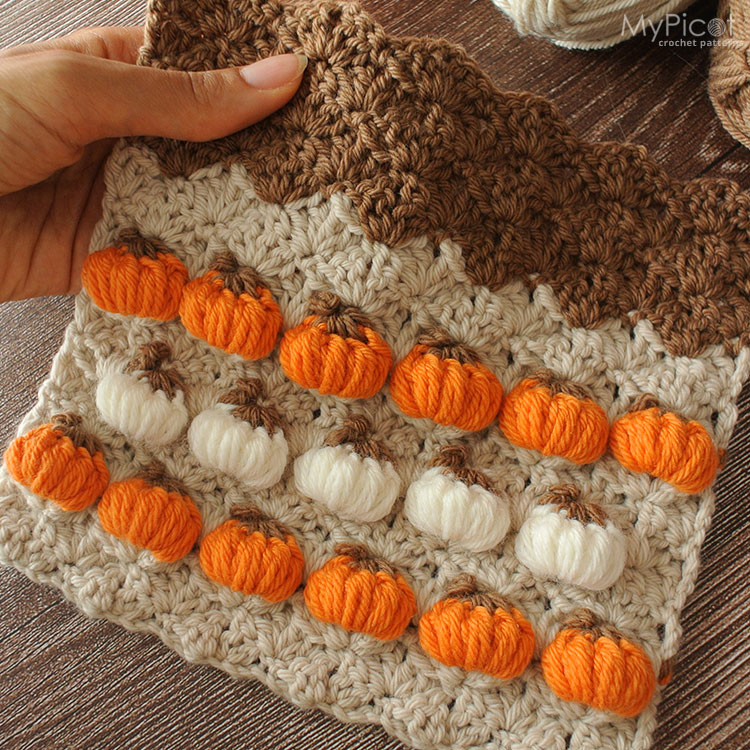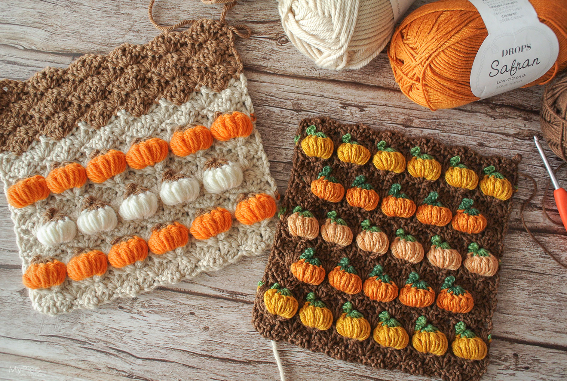 This playful pattern creates autumn texture with pumpkin motifs on a shell stitch background. Perfect for Halloween projects, Thanksgiving decor, seasonal blankets, cozy accessories, and fall home accents.