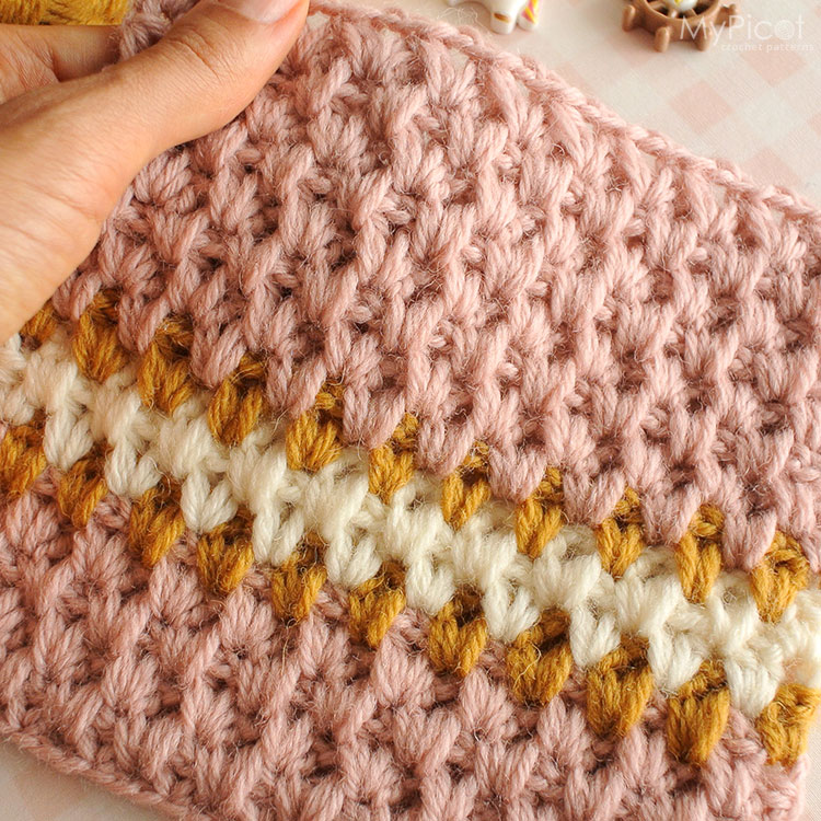 Crochet short row stitch pattern featuring textured bands