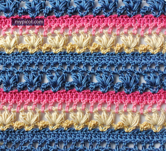 This crochet stitch pattern features triple puff stitches and picots, creating an airy fabric with horizontal stripes of puff Lotus stitches.