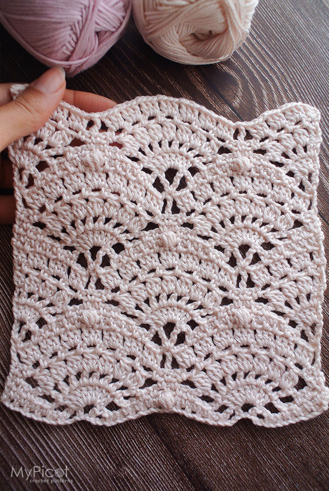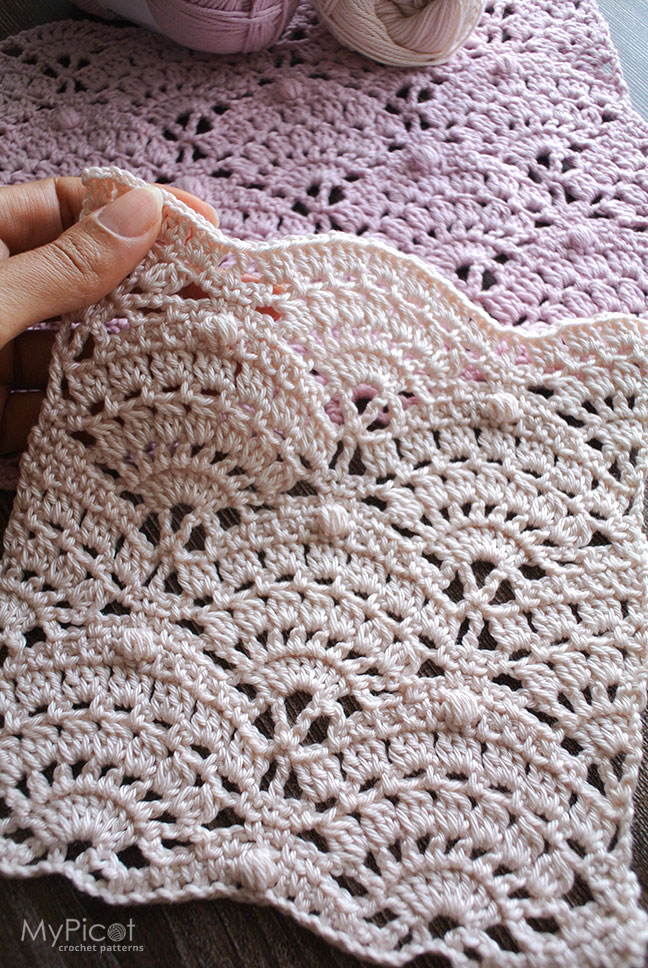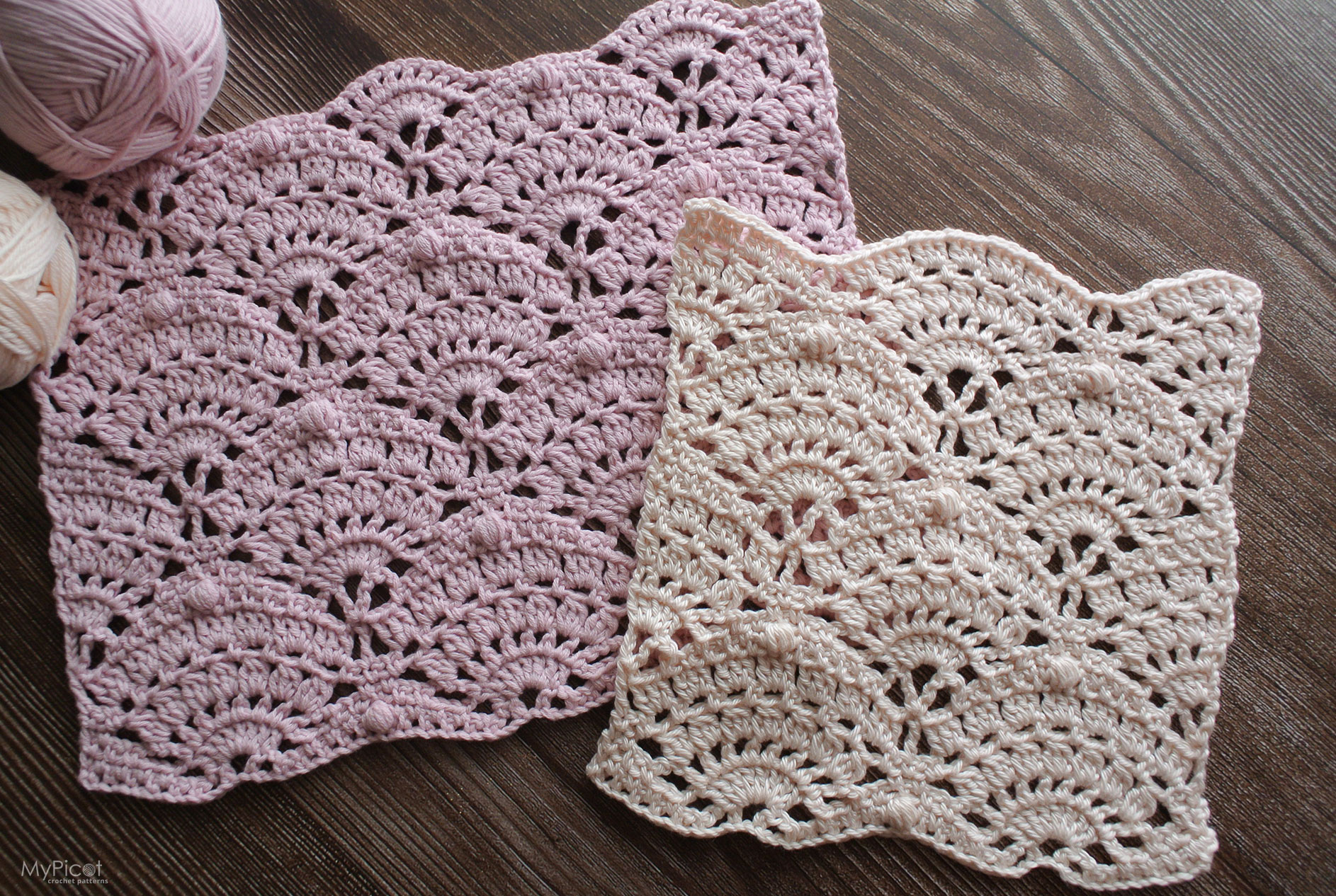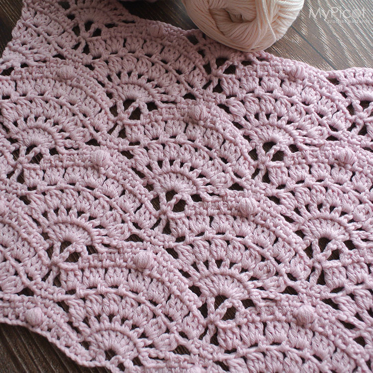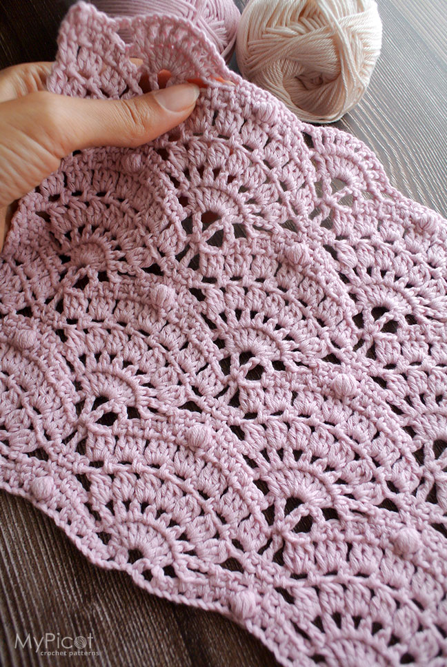 Creates a versatile lace fabric with fan motifs and puff stitches that form subtle geometric patterns throughout. This more substantial lace adapts beautifully to different yarn types, making it perfect for both summer and transitional season pieces.
