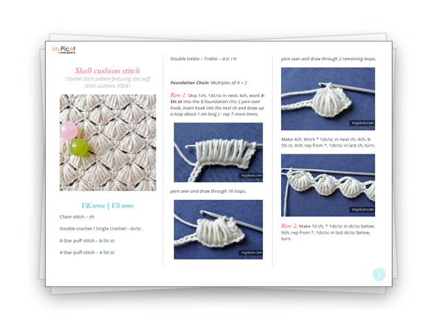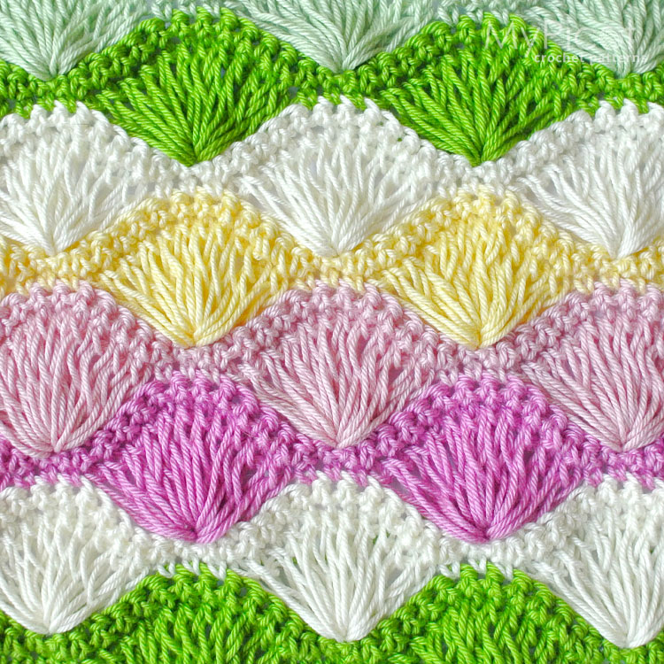 This crochet stitch creates a soft, voluminous fabric with puffy shell motifs, making it ideal for cozy blankets, accessories, and home decor items.