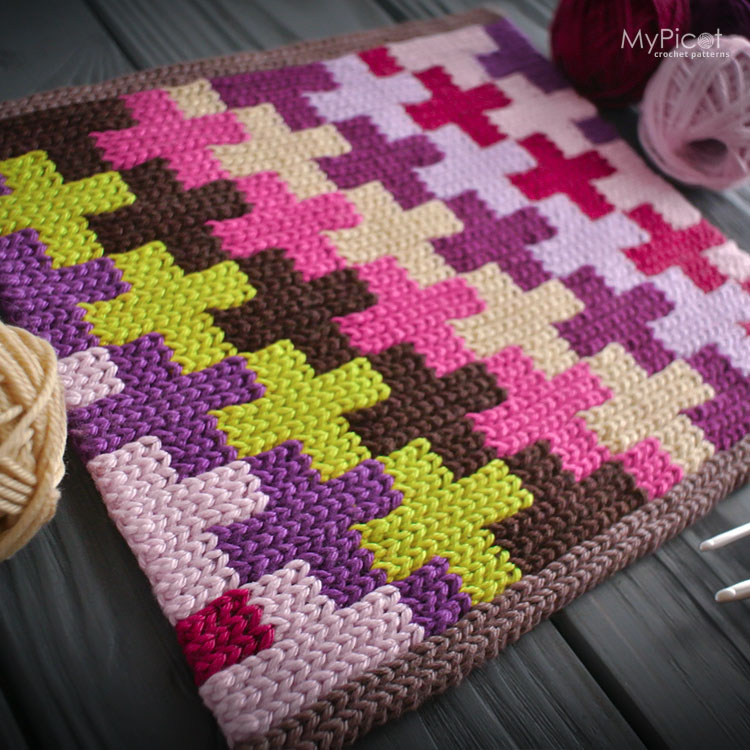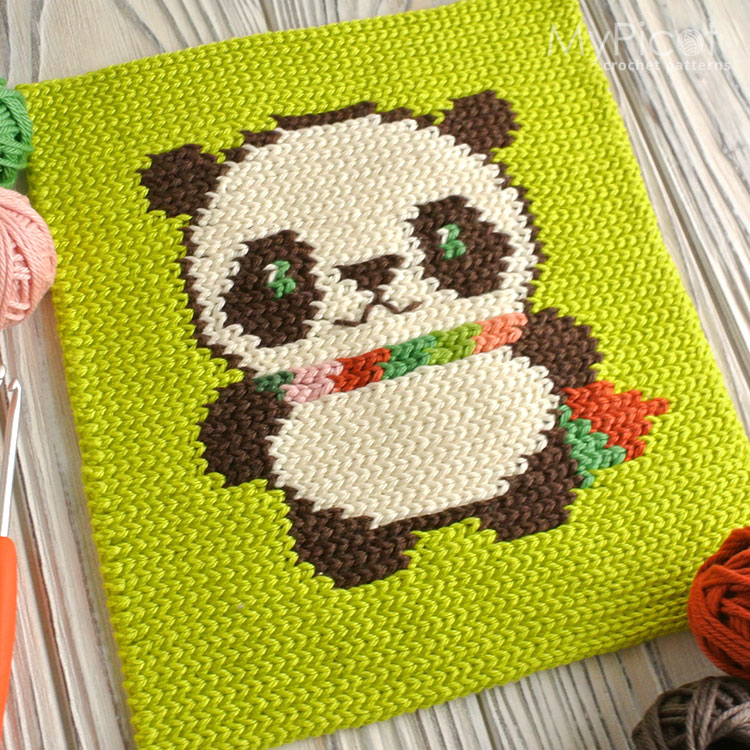 The collection explores two approaches: modular crochet for dimensional blocks like shells and squares, and intarsia for surface prints — pandas, dots, leopard spots, Greek keys. Once you understand the logic, you can design your own charts with grid paper and colored pencils.